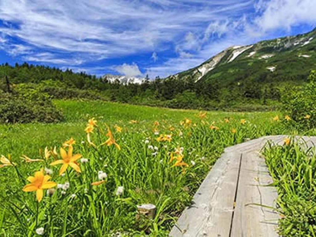 八方尾根は上部を中部山岳国立公園に指定され、白馬三山を筆頭に、唐松岳、五竜岳、鹿島槍ヶ岳など、北アルプス3000m級の山々が眼前に広がります。県の天然記念物に指定され、ここにしかない固有種など貴重な高山植物も生息しています。